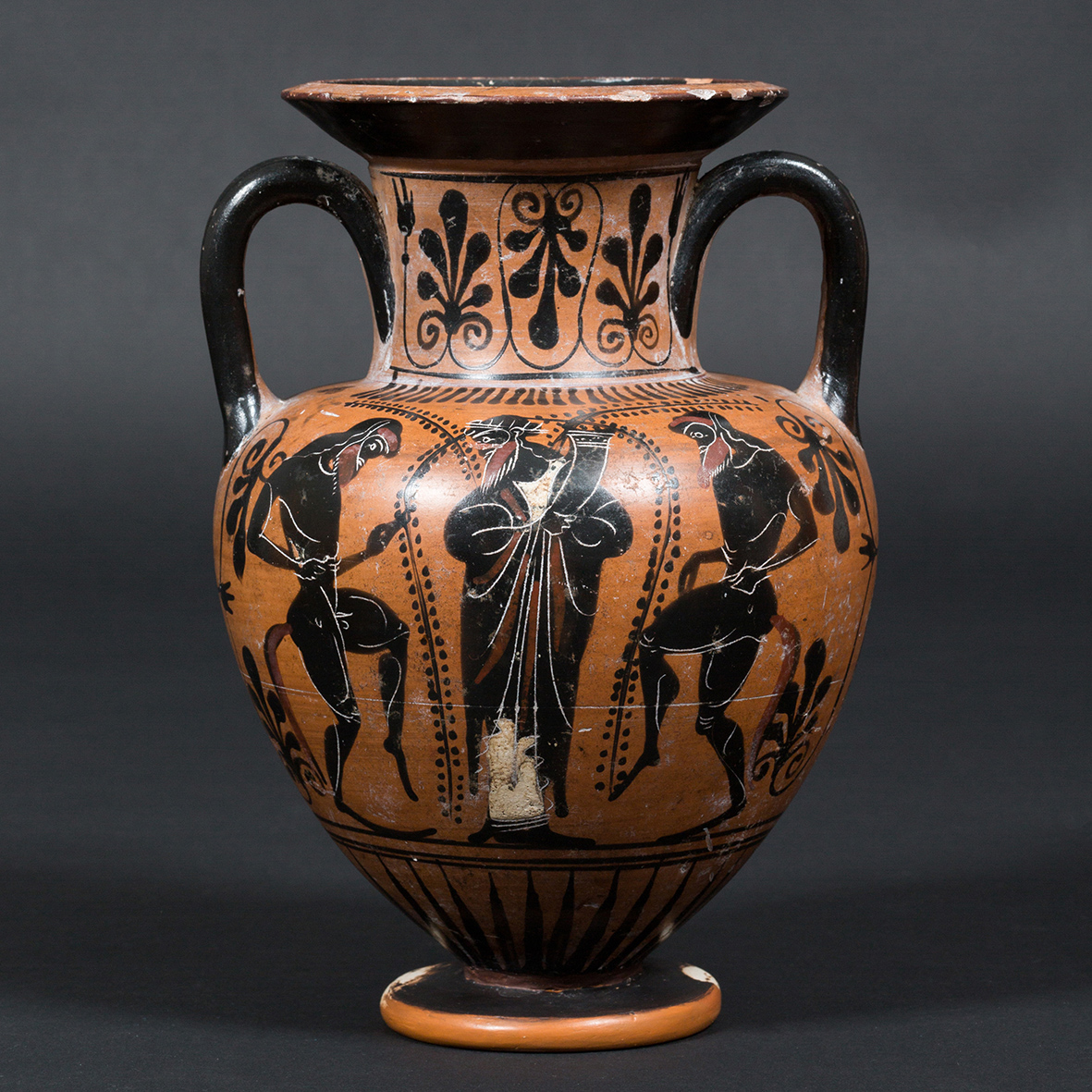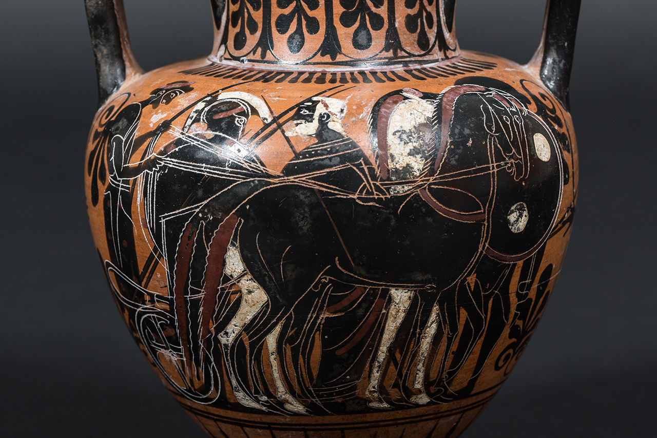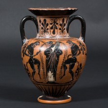 Dans la Grèce antique, certains récipients utilisés au cours des banquets servaient de supports à des scènes du répertoire mythologique ou de la vie du citoyen. Le vin et la guerre y avaient la part belle, et l’amphore choisie ici les conjugue à merveille. D’un côté, Dionysos, le dieu du vin, coiffé d’une couronne de lierre et portant une corne à boire, est entouré de deux satyres. De l’autre, un guerrier sur le départ salue son père, dont la barbe et les cheveux blancs témoignent de l’âge avancé.