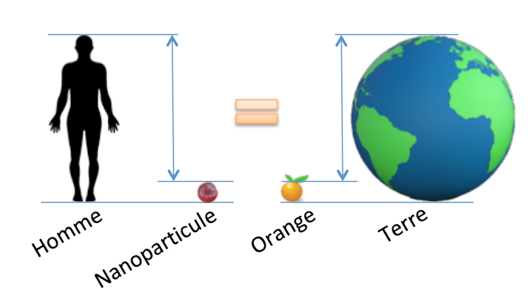 Une norme, ISO TS 27687, rédigée par l’organisation internationale de normalisation, définit ce qu’est une particule « nano » : entre 1 et 100 nanomètres. Pour donner une idée, la différence de taille entre un homme et une nanoparticule correspond à la différence entre la planète Terre et une orange. Il est aussi important de souligner que cette échelle de taille correspond également à celle de la plupart des virus : le virus de la grippe est par exemple assimilable à une sphère d’environ 100 nm.
