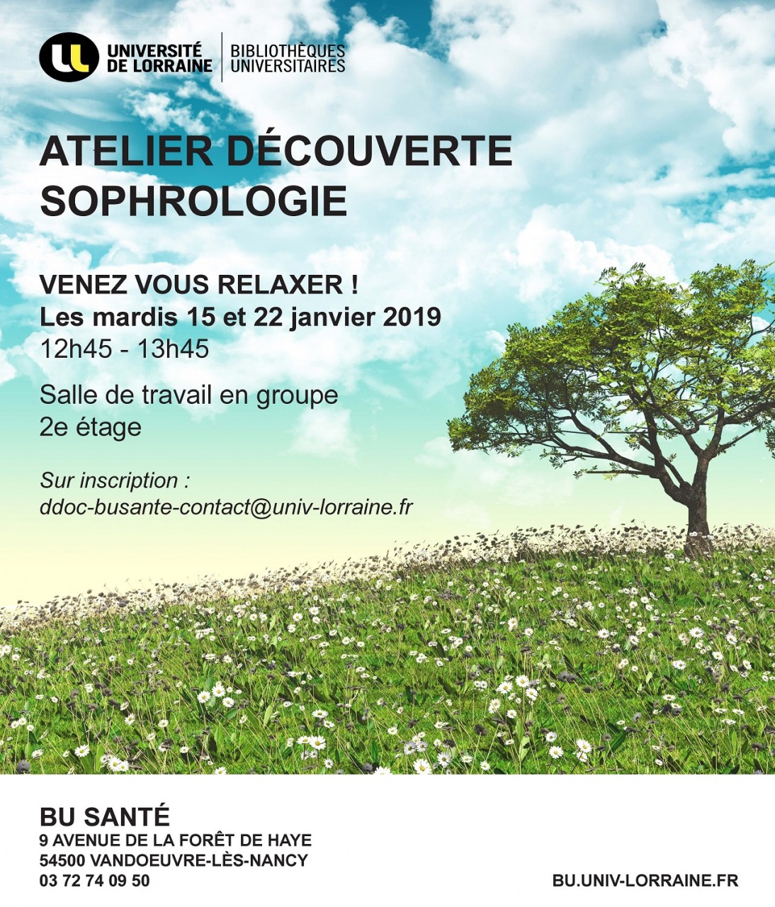 En partenariat avec le SUMPPS, la BU Santé vous propose des ateliers découverte de la sophrologie les mardis 15 et 22 janvier 2019, de 12h45 à 13h45.