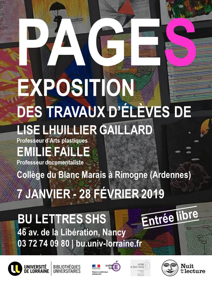 Lise Lhuillier Gaillard, professeur d'arts plastiques, et Emilie Faille, professeur documentaliste proposent une exposition Pages du 7 janvier 2019 au 28 février 2019 à la Bibliothèque universitaire de lettres, sciences humaines et sociales de Nancy.