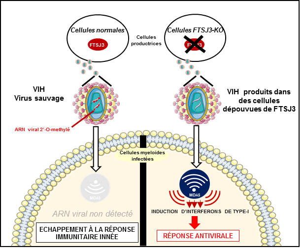 Yuri Motorin : La présence d’ARN viral dans les cellules déclenche la sécrétion d’interféron qui permet l’activation de mécanismes de défense. Malheureusement, ce n’est pas le cas du virus VIH qui ne provoque pas ou très faiblement cette réponse. Notre étude a montré que ceci est dû aux modifications post-transcriptionnelles internes qui décorent l’ARN du VIH. Comme le virus ne possède pas sa propre enzyme permettant de catalyser ces modifications, il recrute une enzyme cellulaire (FTSJ3) pour modifier son propre ARN, ce qui lui permet d’échapper aux détecteurs cellulaires qui sont capables de différencier les ARN du soi et du non-soi (immunité innée).