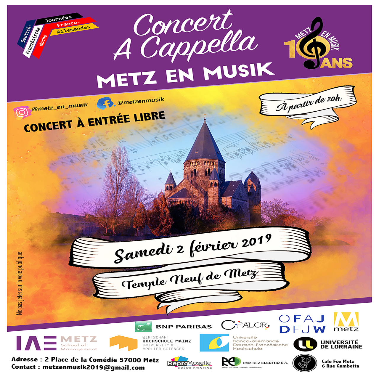 Cinq étudiantes du master Management franco-allemand vous invitent à la dixième édition de l’événement Metz en Musik dans le cadre des Journées Franco-Allemandes de l'IAE de Metz. Venez profiter samedi 2 février au Temple Neuf d’un concert a cappella franco-allemand !