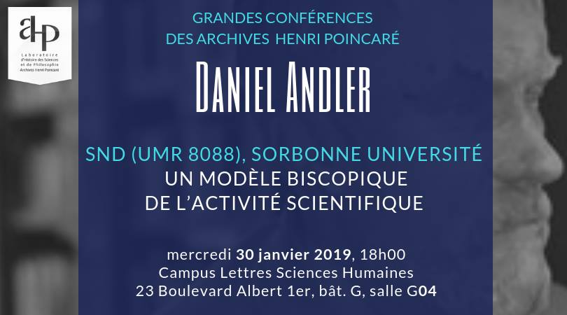 Elle accueillera l'exposé suivant : Daniel ANDLER (SND, UMR 8088, Sorbonne Université) "Un modèle biscopique de l’activité scientifique"