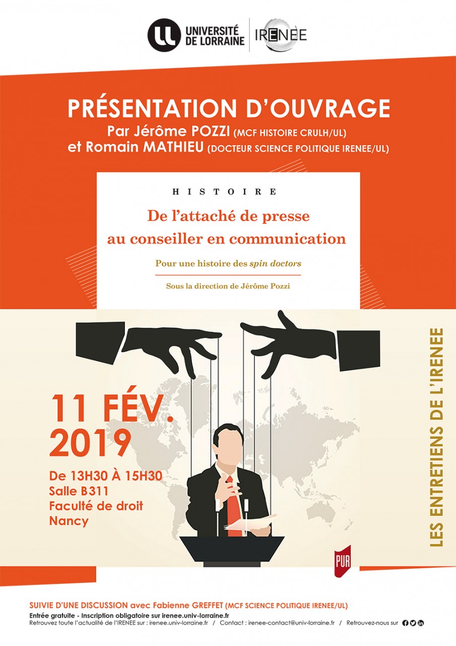Lors des entretiens de l'IRENEE de février 2019, Jérôme POZZI (MCF Histoire, CRULH/UL) et Romain MATHIEU (Docteur en science politique, IRENEE/UL) viendront présenter l'ouvrage "De l'attaché de presse au conseiller en communication" (éditions PUR - Presses Universitaires de Rennes), le lundi 11 février 2019 de 13h30 à 15h30, salle B311, Faculté de droit de Nancy.
