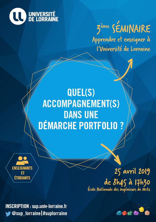 Pour cette 3e édition, la communauté universitaire de l’Université de Lorraine (enseignants, étudiants et personnels) est invitée à assister au Séminaire de Pédagogie Universitaire le jeudi 25 avril 2019 à l’ENIM (Metz) pour échanger et réfléchir ensemble autour de la thématique « Quel(s) accompagnement(s) dans une démarche portfolio ? »