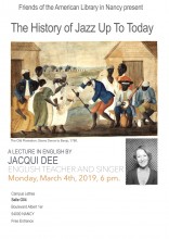 Cette conférence en anglais est proposée par la professeur d'anglais et chanteuse Jacqui Dee sur le thème suivant "The History of Jazz Up to today".