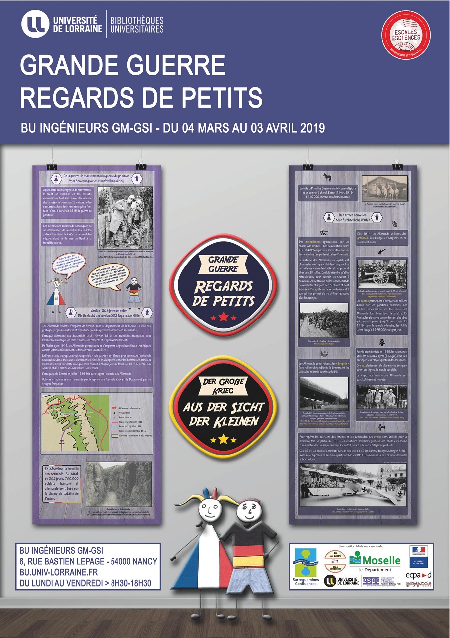 Cette exposition bilingue franco-allemande, conçue par l'ESPE de Sarreguemines, propose une vision biculturelle de la Première Guerre mondiale en nous plongeant dans l’histoire de Fleur et de son cousin Hans, deux enfants de 10 ans, de nationalité française pour le premier et allemande pour le second. Elle rappelle notamment combien le destin des hommes, qu’ils soient soldats français ou soldats allemands, était le même, surtout à hauteur d’enfants.