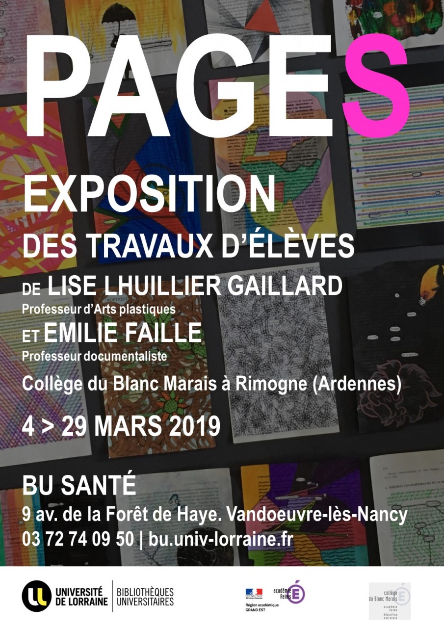 Lise Lhuillier Gaillard, professeur d'arts plastiques, et Emilie Faille, professeur documentaliste proposent l'exposition Pages du 4 au 29 mars 2019 à la Bibliothèque universitaire de Santé à Vandoeuvre-lès-Nancy.