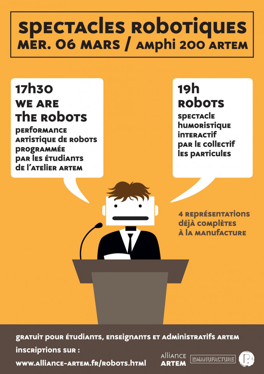 Le résultat des travaux menés par les étudiants de l'atelier We Are The Robots avec l'encadrement de Patrick Hénaff (enseignant Mines Nancy) et Raphaël Gouisset, metteur en scène et artiste invité sera visible le mercredi 06 mars prochain suivi d’un spectacle humoristique du collectif Les Particules, en partenariat avec le théâtre de la Manufacture.