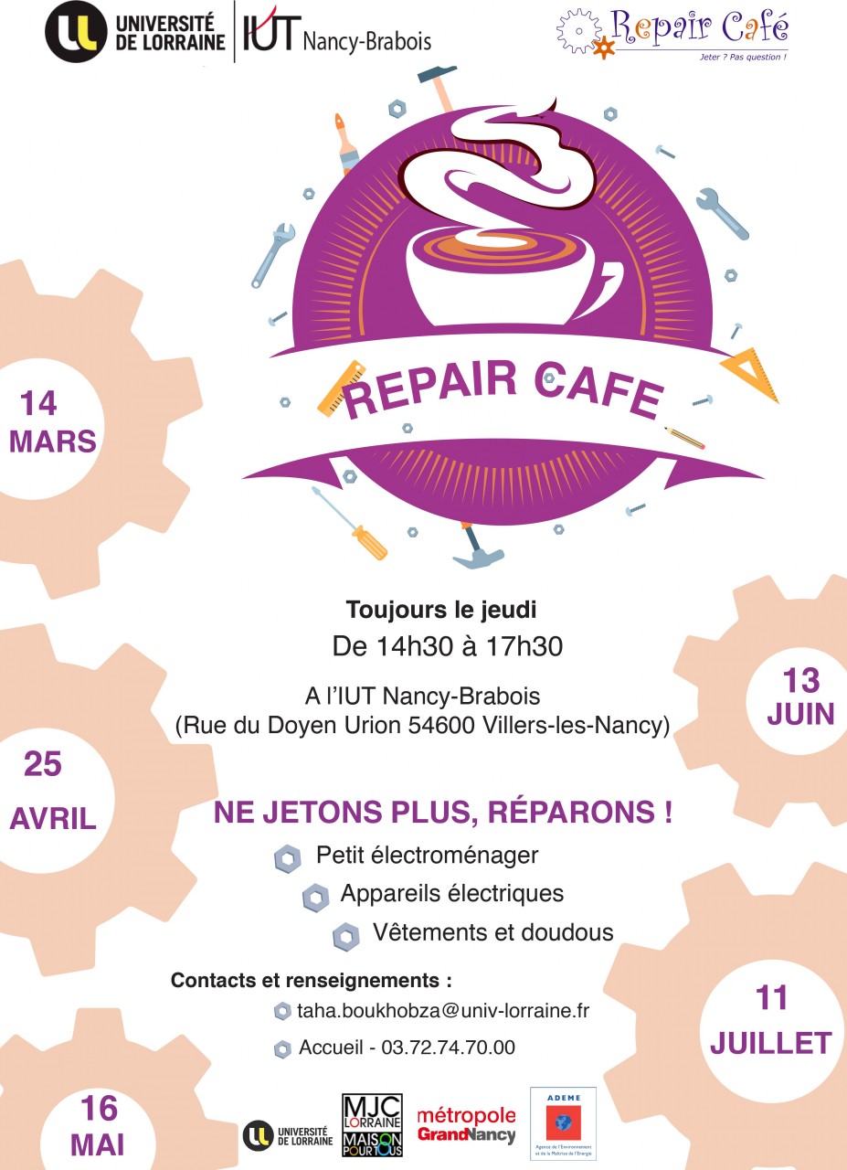 L'Université de Lorraine proposera différents Repair Cafés dans ses composantes, IUT, Facultés, UFR... régulièrement, le prochain aura lieu à Metz le 21 mars. Les objectifs de cette action sont simples : redonner une seconde vie à du matériel, limiter la production de déchets et participer à une action de développement durable!