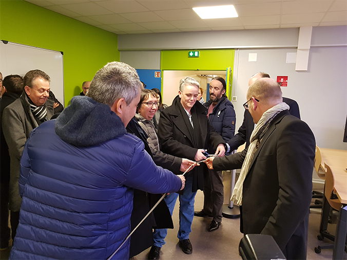 La seconde inauguration concerne la transformation d’une salle de TP du département ‘Génie Electrique et Informatique Industrielle’ (GEII) en un nouvel espace pédagogique innovant, conçu suivant le concept du ‘co-working’ (travailler ensemble). Cette salle est ainsi composée de 6 ilots entièrement modulables et connectés pour favoriser le travail en groupes et en mode projet. Le dispositif numérique de partage des écrans, entre les groupes projet et/ou l’enseignant, favorise les échanges et la restitution en commun des travaux réalisés.