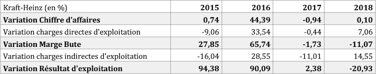 Cela signifie que les mauvais résultats de Kraft-Heinz en 2018 ne sont pas seulement dus aux dépréciations d’actifs, mais aussi à une dégradation généralisée de son exploitation, preuve de l’échec de l’application du « cost killing ». Pour autant, le résultat d’exploitation reste supérieur à la moyenne du secteur. C’est donc davantage la tendance que le résultat en lui-même qui est inquiétant si la désaffection des consommateurs pour les produits de Kraft-Heinz perdure dans le temps.