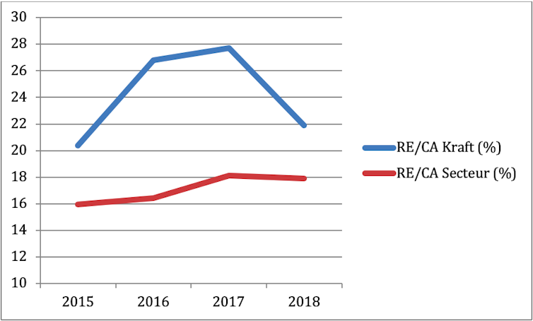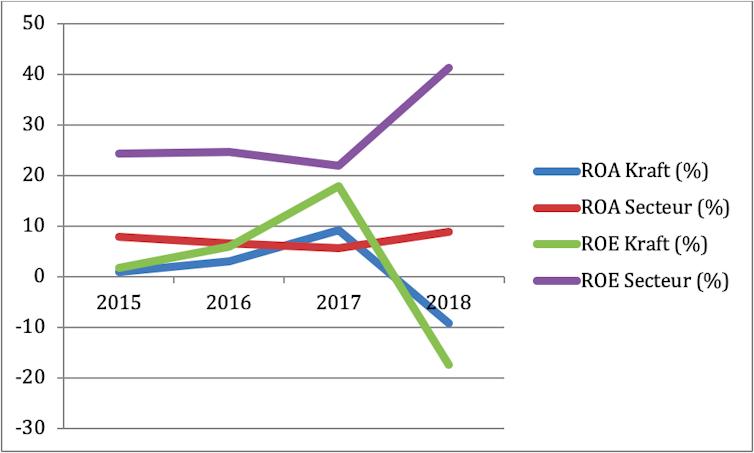 L’observation de l’évolution de la rentabilité économique (ROA) de Kraft-Heinz permet de comprendre l’engouement des investisseurs pour Kraft-Heinz et sa politique de chasse aux coûts car celle-ci s’est nettement améliorée de 2015 à 2017 au point de devenir alors supérieure à celle de son secteur. La rentabilité financière (ROE) s’est également accrue de 2015 en 2017 et semblait d’ailleurs sur le point de rattraper la moyenne sectorielle avant de chuter brutalement.