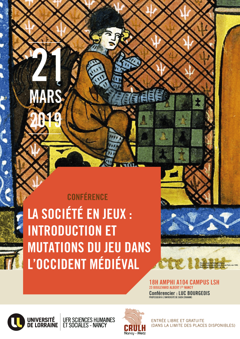 Lors de cette deuxième conférence du cycle ARTIFEX de l’année 2018-2019, nous aurons le plaisir d’écouter M. Luc Bourgeois, professeur d’archéologie médiévale à l’université de Caen-Normandie (centre Michel de Boüard – CRAHAM), qui évoquera la question du jeu et de son évolution dans la société de l’Occident médiéval. La conférence aura lieu le jeudi 21 mars 2019 à 18h sur le campus Lettres et Sciences Humaines de Nancy (salle A104).