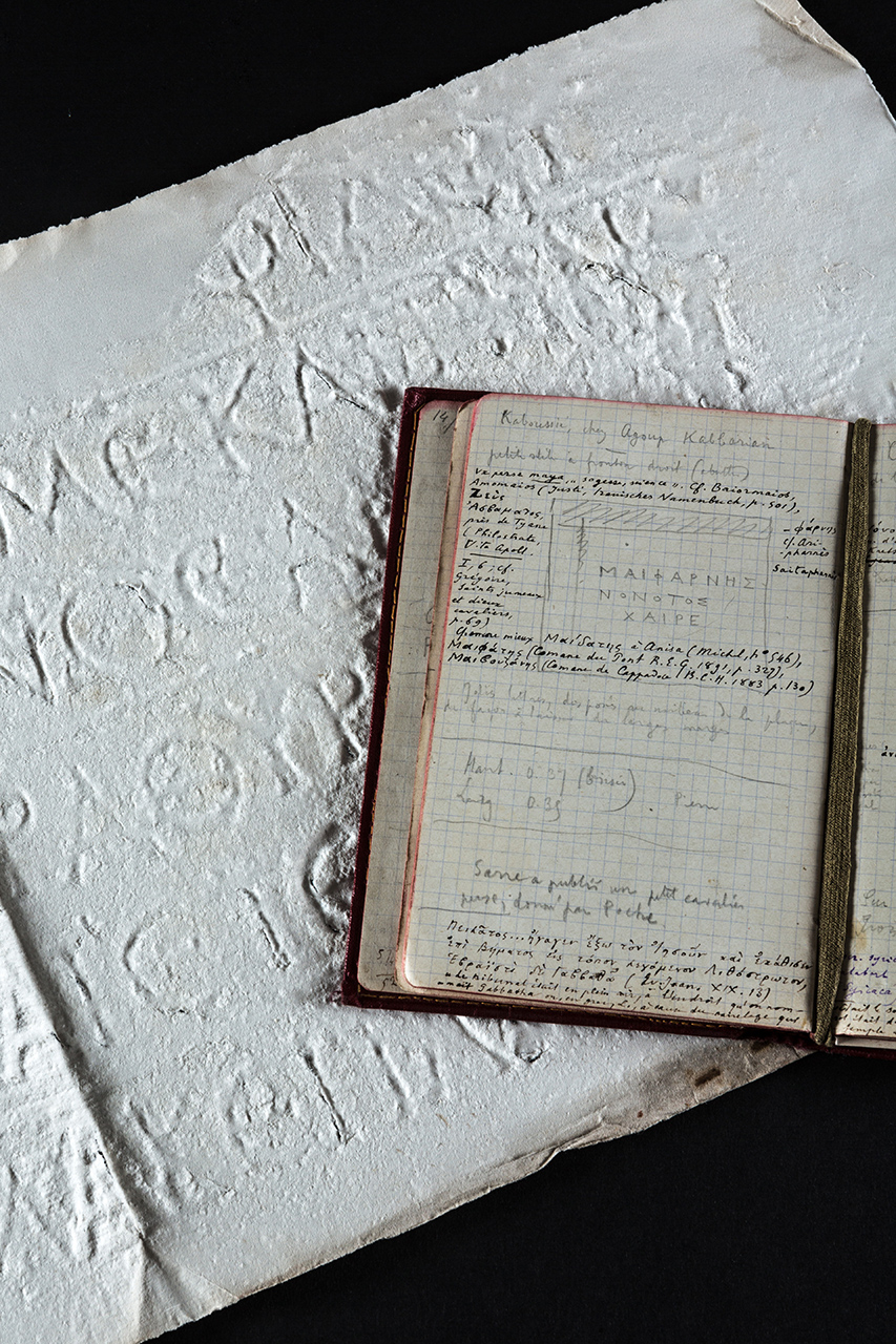 À gauche : estampage et carnet ; ci-dessous : site de l’acropole de Séleucie de Piérie, à proximité d’Antioche, 1924. Dimensions de l’estampage : 160x27cm. Fonds d’archives Paul Perdrizet, UFR Sciences Humaines et Sociales, Nancy