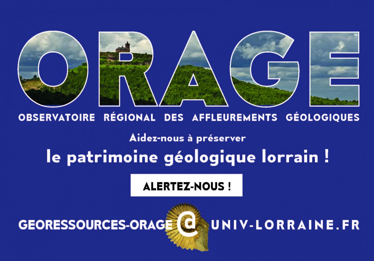 ORAGE est un dispositif dont l'objectif est de préserver le patrimoine géologique lorrain en invitant le grand public à alerter des scientifiques lorsqu'ils découvrent une nouvelle carrière, un talus, les fondations d'une nouvelle construction.