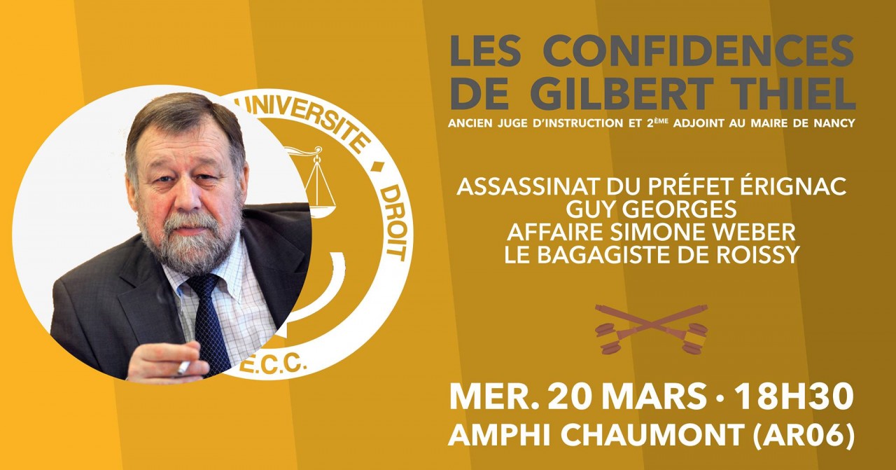 Un intervenant de choix sera présent à cette conférence puisqu'il s'agit de M. Gilbert Thiel, Ancien juge d'instruction et 2ème adjoint au maire de Nancy qui nous dévoilera ses confidences et son expérience de juge d'instruction concernant les affaires qu'il a dû traiter (assassinat du préfet Erignac, Guy Georges, Affaire Simone Weber, le bagagiste de Roissy et bien d'autres)