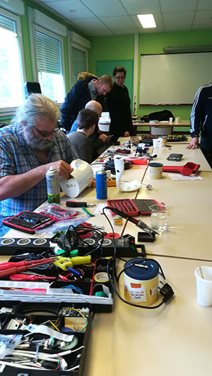 Après la pesée de l’objet, on fait appel aux compétences des uns et des autres. Electronique, électricité, couture, soudure, les compétences des uns et des autres sont variées : certains sont « du métier », d’autres ont appris. Le point commun entre tous ces volontaires, c’est la curiosité et l’envie de ne pas voir partir à la poubelle ces objets.