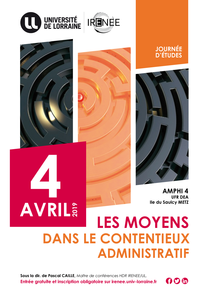 Journée d'études : Les moyens dans le contentieux administratif le jeudi 4 avril 2019 à partir de 9h00, AMPHI 4 - UFR DEA METZ sous la direction de Pascal CAILLE, Maître de conférences HDR IRENEE/UL.