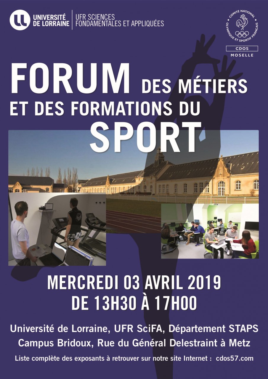 Le Comité Départemental Olympique et Sportif de la Moselle en partenariat avec le Département STAPS de Metz de l'Université de Lorraine organise le forum des métiers et des formations du sport. A cette occasion, nous vous proposons de venir échanger avec des professionnels qui interviennent dans les différents secteurs du sport : l’enseignement, l’animation, l’entrainement, la santé, le handicap, la gestion et le développement des organisations. L’Université de Lorraine, le Ministère des Sports, le CFA FORM'AS, le CROS Grand-Est et les Fédérations Sportives seront là pour vous présenter les différentes possibilités de formation. L’ANDIISS vous présentera les différents métiers de la Fonction Publique Territoriale et les concours pour y accéder. Le CDOS 57 présentera le Certificat de Formation à la Gestion Associative destiné aux bénévoles.