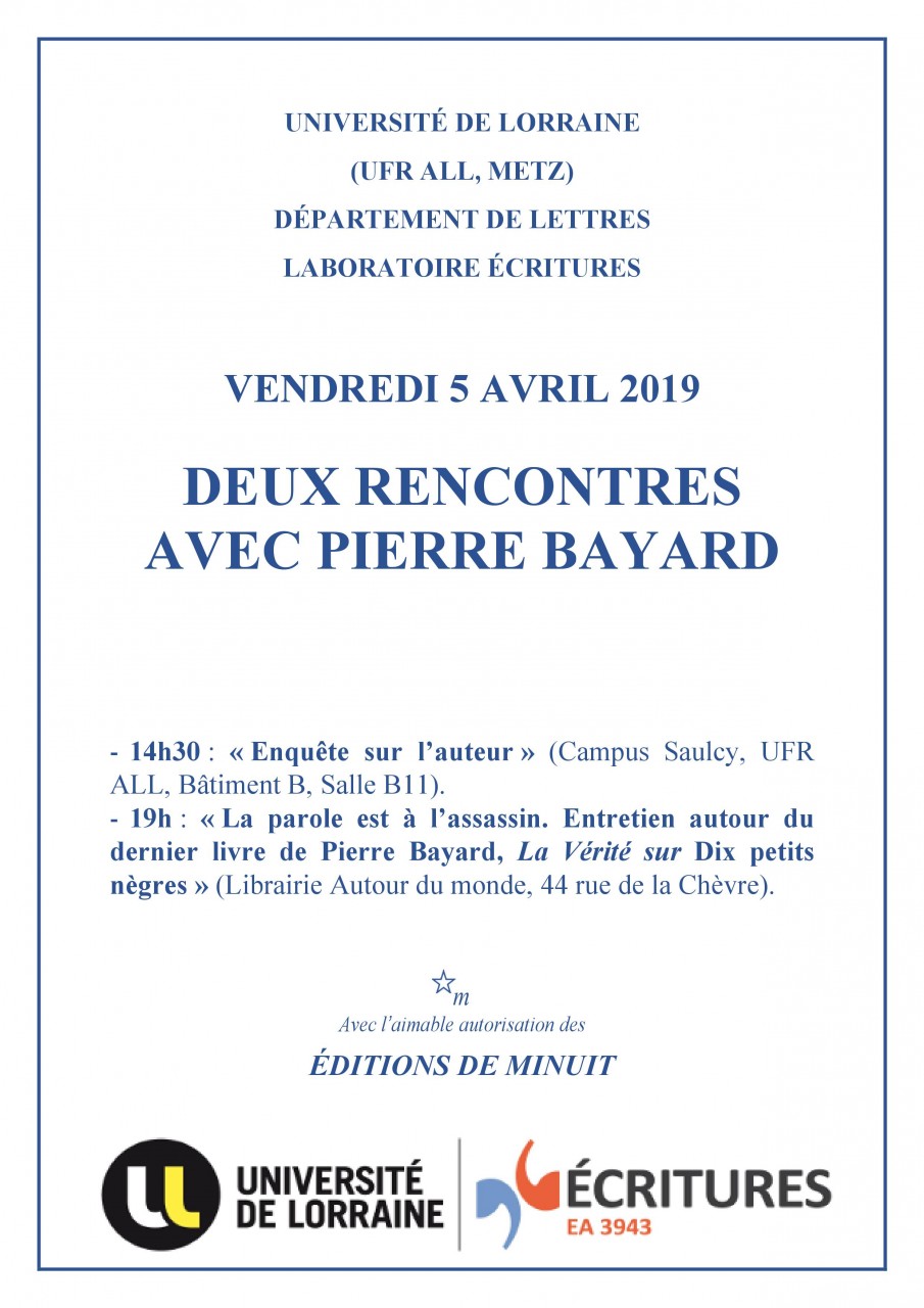 Le vendredi 5 avril 2019, le département de lettres de l'UFR Arts Lettres et Langues - Metz, et le laboratoire Écritures auront le plaisir d'accueillir le critique et psychanalyste Pierre Bayard pour une double rencontre :