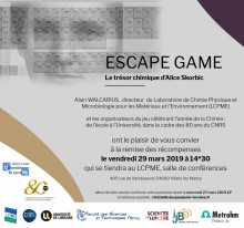 4 enseignants-chercheurs et chercheurs du Laboratoire de Chimie Physique et Microbiologie pour les Matériaux et l’Environnement (LCPME, UMR 7564 UL/CNRS) organisent pour des lycéens d’établissements lorrains un « escape game » sur le thème de la Chimie le vendredi 29 Mars 2019 à la Faculté des Sciences et Technologies de Vandoeuvre entre 9h30 et 12h00. Cet évènement est organisé dans le cadre de la célébration des 80 ans du CNRS et de l’année de la chimie : de l’école à l’université.
