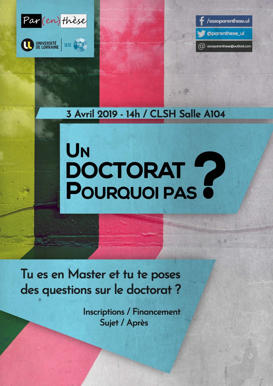 Les membres de l’association Par(en)thèse (doctorantes et doctorants en Lettres et Sciences Humaines) répondent à toutes vos questions autour d’un café le mercredi 3 avril de 14h à 17h en salle A104 sur le Campus Lettres et Sciences Humaines !