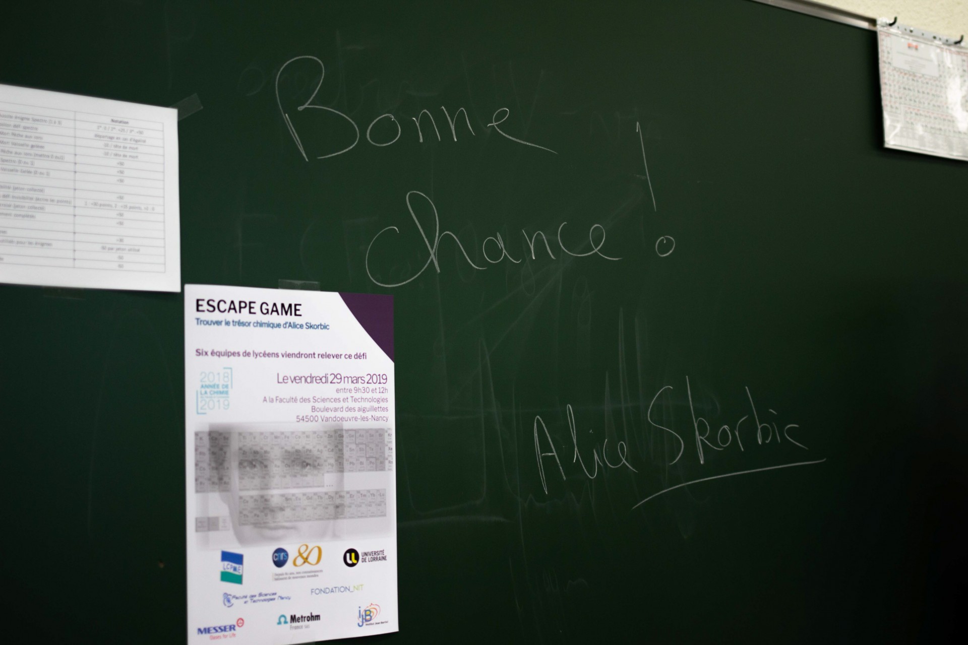 Le 29 mars, 4 enseignants chercheurs et chercheurs du LCPME (Laboratoire de Chimie Physique et Microbiologie pour les Matériaux et l’Environnement) ont organisé un Escape Game sur le thème de la chimie pour 24 lycéens venus de 6 établissements lorrains (lycée Stanislas – Villers les Nancy, lycée F. Chopin – Nancy, lycée Marquette – PAM, lycée Pierre Mendès France – Epinal, lycée Saint Louis – Bar le Duc, lycée Poincaré – Bar le Duc).