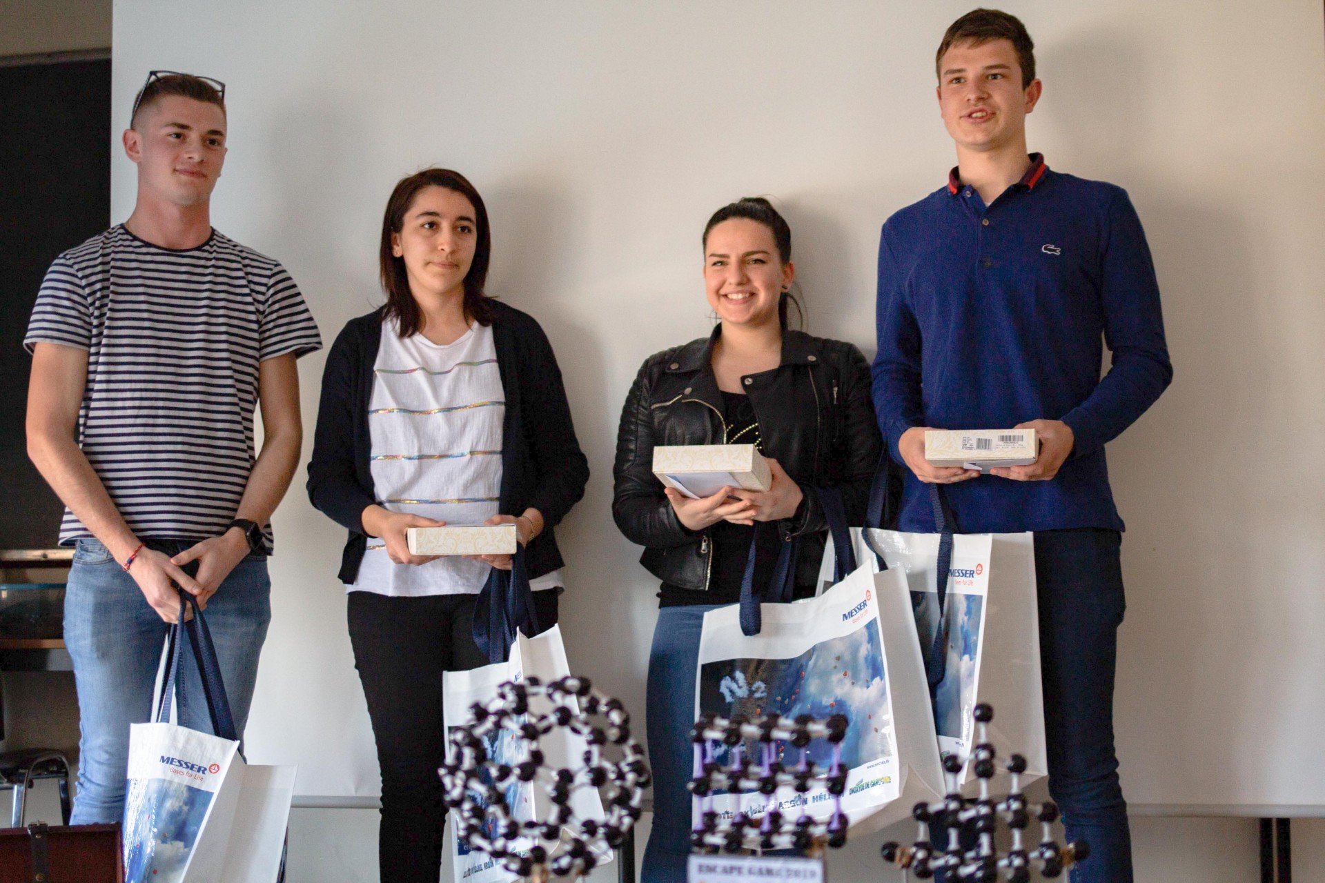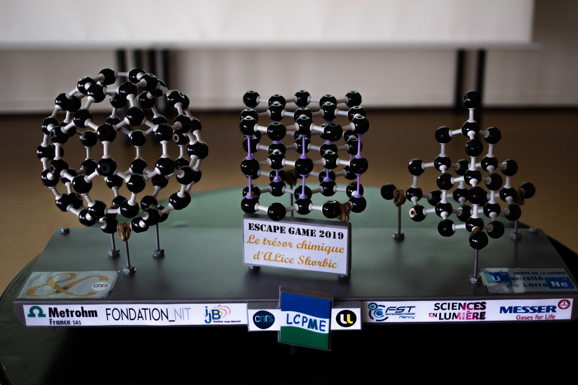 Par équipe de 4, les élèves de 1ère et terminale S ou STL se sont lancés dans la résolution d’énigmes faisant appel autant à leur sens de l’observation, leur culture générale qu’à leur dextérité pratique dans les salles de TP de la Faculté des Sciences et Technologies. Après avoir accumulé les indices en équipe, les lycéens n’ont réussi à débusquer le fabuleux trésor qu’en mettant en commun les éléments de chacun. Une malle renfermait le trophée : une maquette représentant 3 organisations différentes des atomes de carbone, le diamant, le graphite et le fullerène. Elle contenait également un message félicitant les élèves pour leur sagacité et leur réussite.