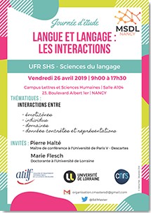 En tout, dix-huit étudiant.e.s (niveau licence, master et thèse) ainsi que deux conférenciers invités : Pierre Halté, maître de conférence à l'université de Paris V, Descartes et Marie Flesch, doctorante à l'Université de Lorraine présenteront les résultats de leurs recherches abordant les thèmes de : l'émoticône, les émojis, le couple regard-pointage en langue des signes française, le passif pronominal, l'acquisition de la syntaxe chez les enfants francophones à travers l'étude de corpus, la place du langage en situation de travail etc ...