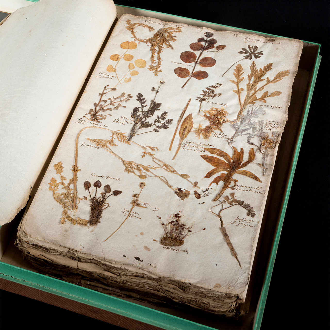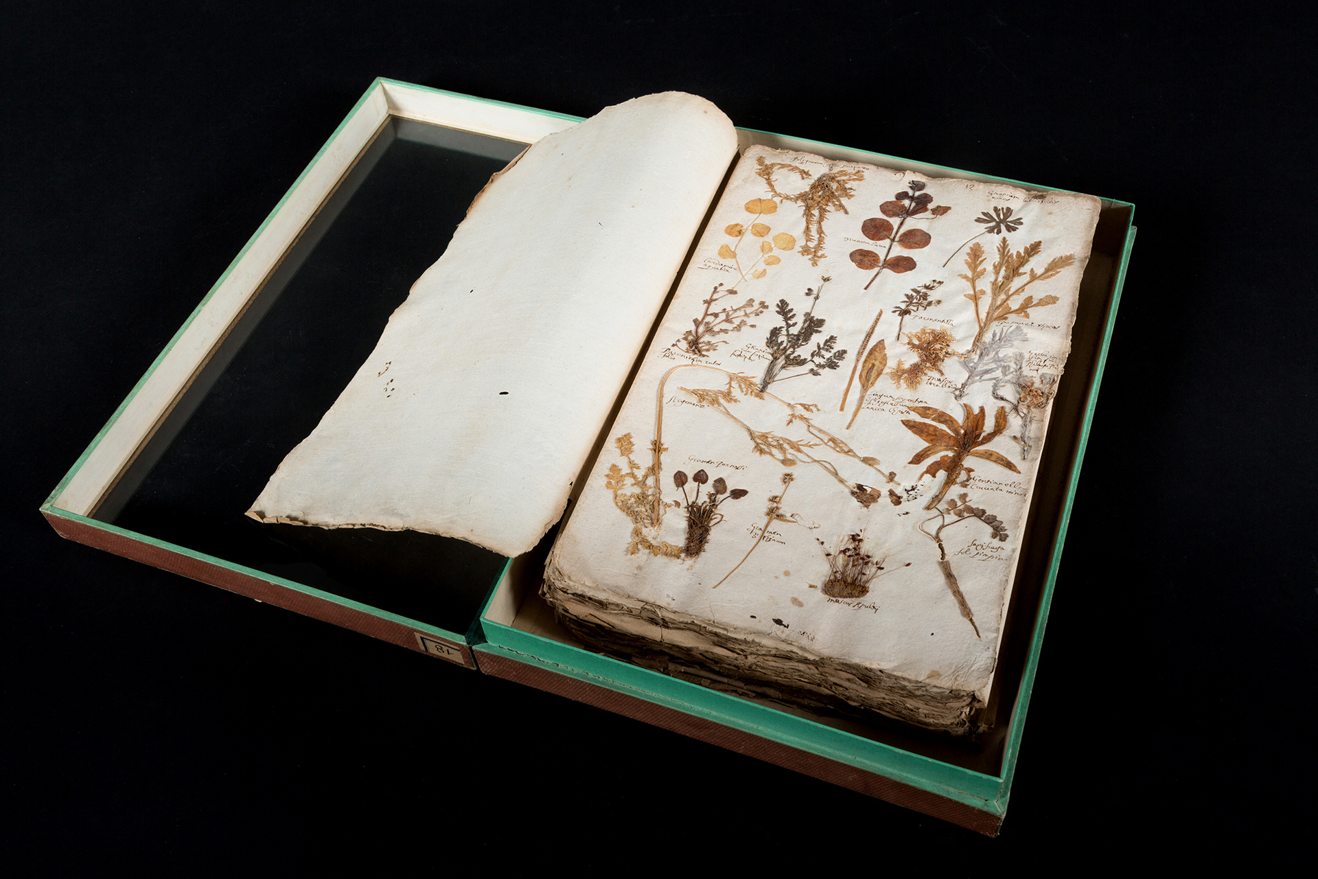 Ci-dessus, l’une des deux boites de feuillets contenant l’herbier. Dimensions : 33x21cm, 1640. Herbiers des Jardins Botaniques du Grand Nancy et de l’Université de Lorraine