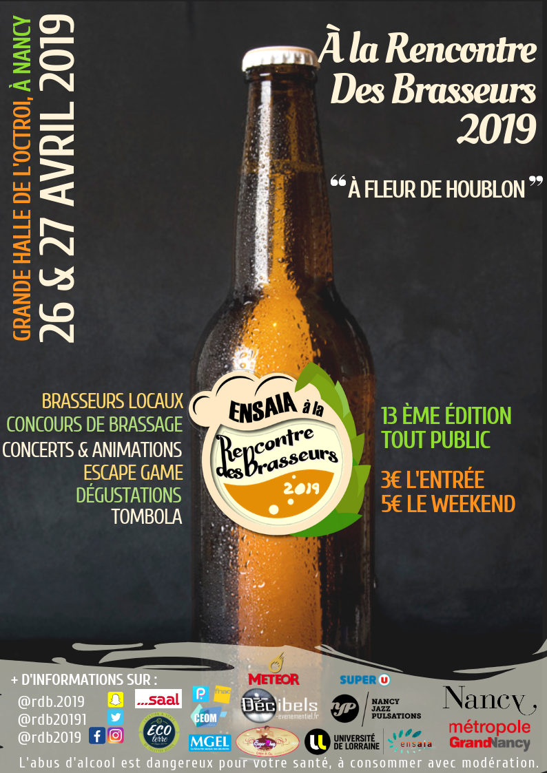 A la Rencontre des Brasseurs fait son retour vendredi 26 et samedi 27 avril pour une nouvelle édition, dans un nouveau lieu, La Halle de l'Octroi de Nancy, et également dans un nouveau format. Proposée depuis 1995 par le Comité Etudiant d'Organisation des Manifestations ENSAIA, "A la Rencontre des Brasseurs" est un événement festif ouvert à tous qui perpétue l’histoire de Nancy, terre de Brasseurs et témoigne de l'histoire de l'école issue de la fusion de 3 écoles nancéiennes, l'Ecole d'Agronomie, l'Ecole de Laiterie et l'École Nationale de Brasserie de Nancy.
