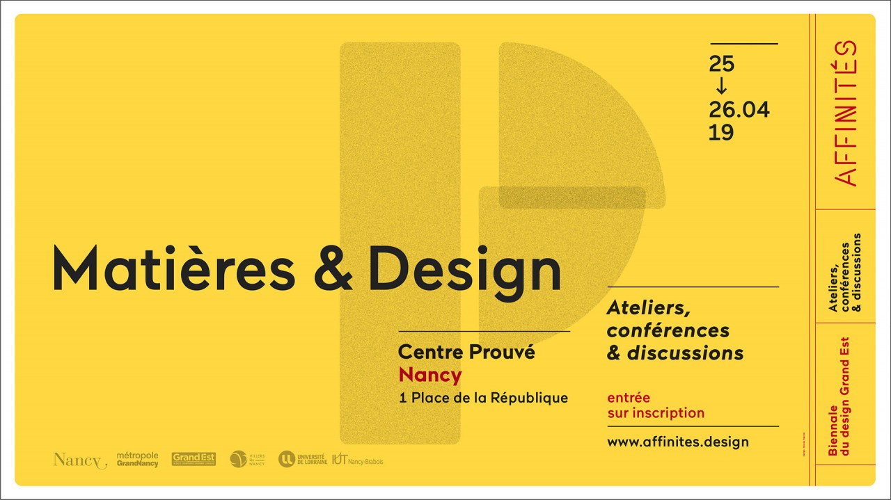 Dans le cadre d'Affinités Biennale du Design Grand Est, un cycle de conférences, des ateliers et des discussions autour de la thématique Matières & Design auront lieu les 25 et 26 avril au Centre Prouvé Nancy.