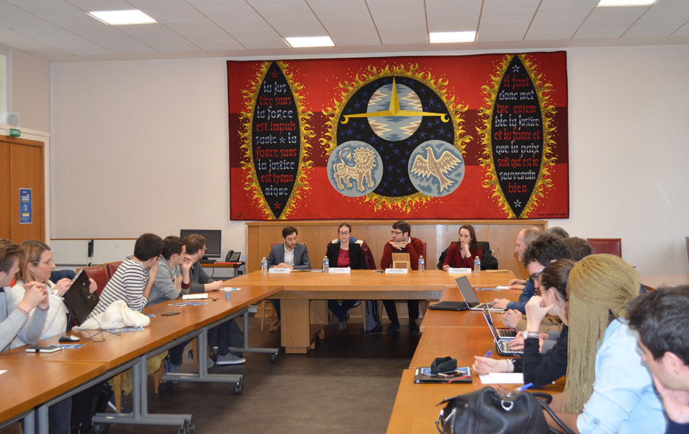 Légende des photos - les intervenants (de gauche à droite) - Antoine HARQUET, Doctorant IRENEE / UL (Le mécanisme du Spitzenkandidat, un coup de force démocratique du Parlement européen ?), Claire MATHIEU, Doctorante IRENEE / UL (Les partis politiques européens, quelle influence sur le fonctionnement du Parlement européen ?), Jean-Félix DELILE, Maître de conférences en droit public IRENEE / UL (Conclusions du workshop), Pascaline MOTSCH, Doctorante IRENEE / UL (Les conséquences du Brexit sur le Parlement européen).