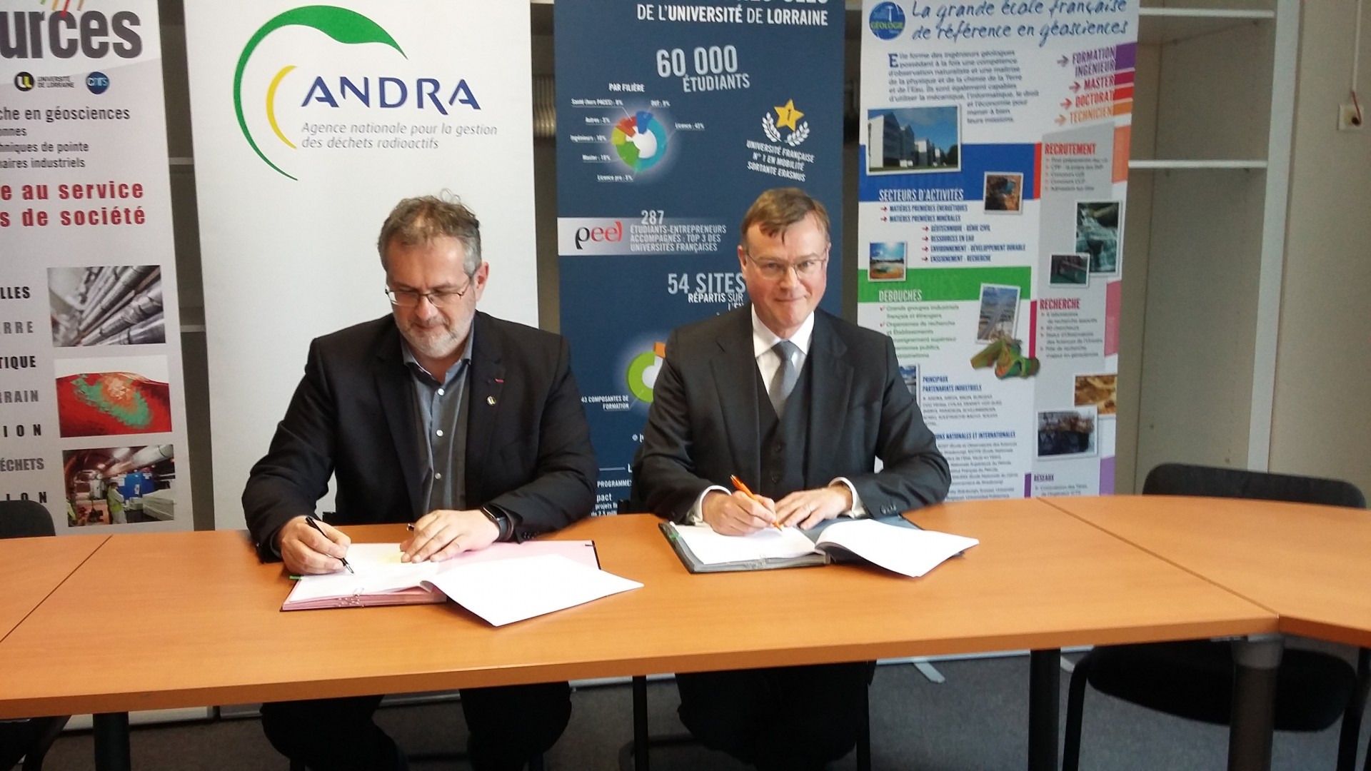 Le 10 mai 2019, Pierre Mutzenhardt, président de l’Université de Lorraine et Pierre-Marie Abadie, directeur général de l’Andra, en présence de Claude Léonard, président du Conseil départemental de la Meuse, ont signé au sein de l’Ecole nationale supérieure de géologie (ENSG), un nouveau partenariat pour faire des savoirs, des savoir-faire et outils de l’Andra et de l’Université de Lorraine une opportunité pour le territoire.