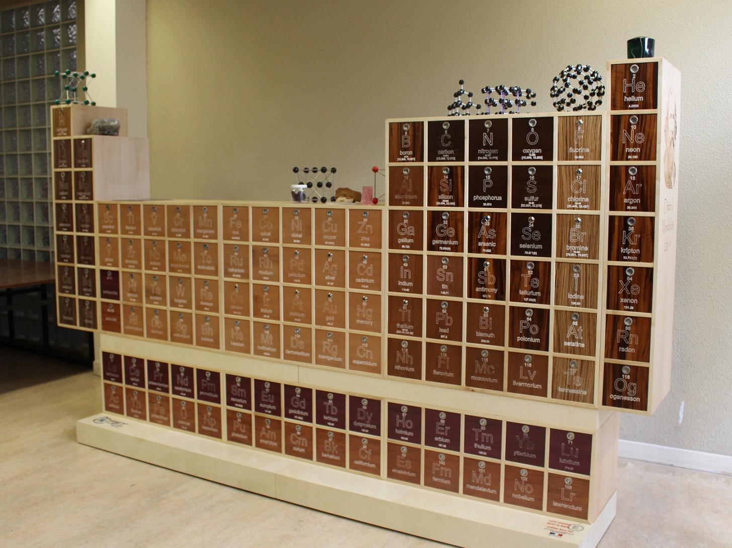 Les élèves ont réalisé un meuble en bois de 3 mètres de long sur 1m80 de haut, comportant des tiroirs présentant l’ensemble des 118 éléments chimiques connus à ce jour. Dans chaque tiroir sont placés un élément chimique et l’une de ses applications utilisée dans la vie courante. Ce meuble donne une représentation en 3D de la classification périodique des éléments et permet à des publics non spécialistes d’acquérir les notions élémentaires de la chimie. Un descriptif sur l’histoire de l’atome et le tableau périodique de Mendeleïev accompagne l’installation ainsi que des fiches explicatives. Chaque fiche explicite un élément chimique et ses différentes caractéristiques.