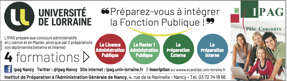 - La préparation externe de l'IPAG de Nancy est ouverte à tous et vous prépare aux concours administratifs de catégorie A, voire B dans le cadre d'une formation intensive accessible avec un niveau Licence III. Enseignants-chercheurs et professionnels de l'administration vous préparent par des enseignements méthodologiques et fondamentaux ainsi que par des galops d'essais réguliers. Enfin vous bénéficiez d'une préparation personnalisée et individuelle aux oraux en cas d'admissibilité à un concours. Plus de renseignements sur : http://ipag.univ-lorraine.fr/formations/preparations-aux-concours-externes/