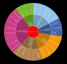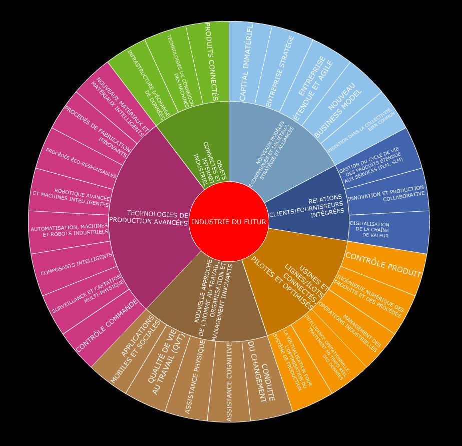 Une manière intéressante de considérer cette thématique est celle proposée par le Centre technique des industries mécaniques (CETIM), qui propose une représentation circulaire des divers enjeux, sujets, axes de travail qui font partie intégrante de l’industrie du futur. On retrouve six grands domaines, dont certains sont essentiellement orientés « techno » – usines, lignes et îlots connectés, pilotés et optimisés ; objets connectés et internet industriel ; technologies de production avancées –, mais en intégrant également des dimensions traditionnellement déportée de l’usine – relations clients/fournisseurs intégrées ; nouveaux modèles économiques et sociétaux ; l’homme au travail, organisation et management innovants.