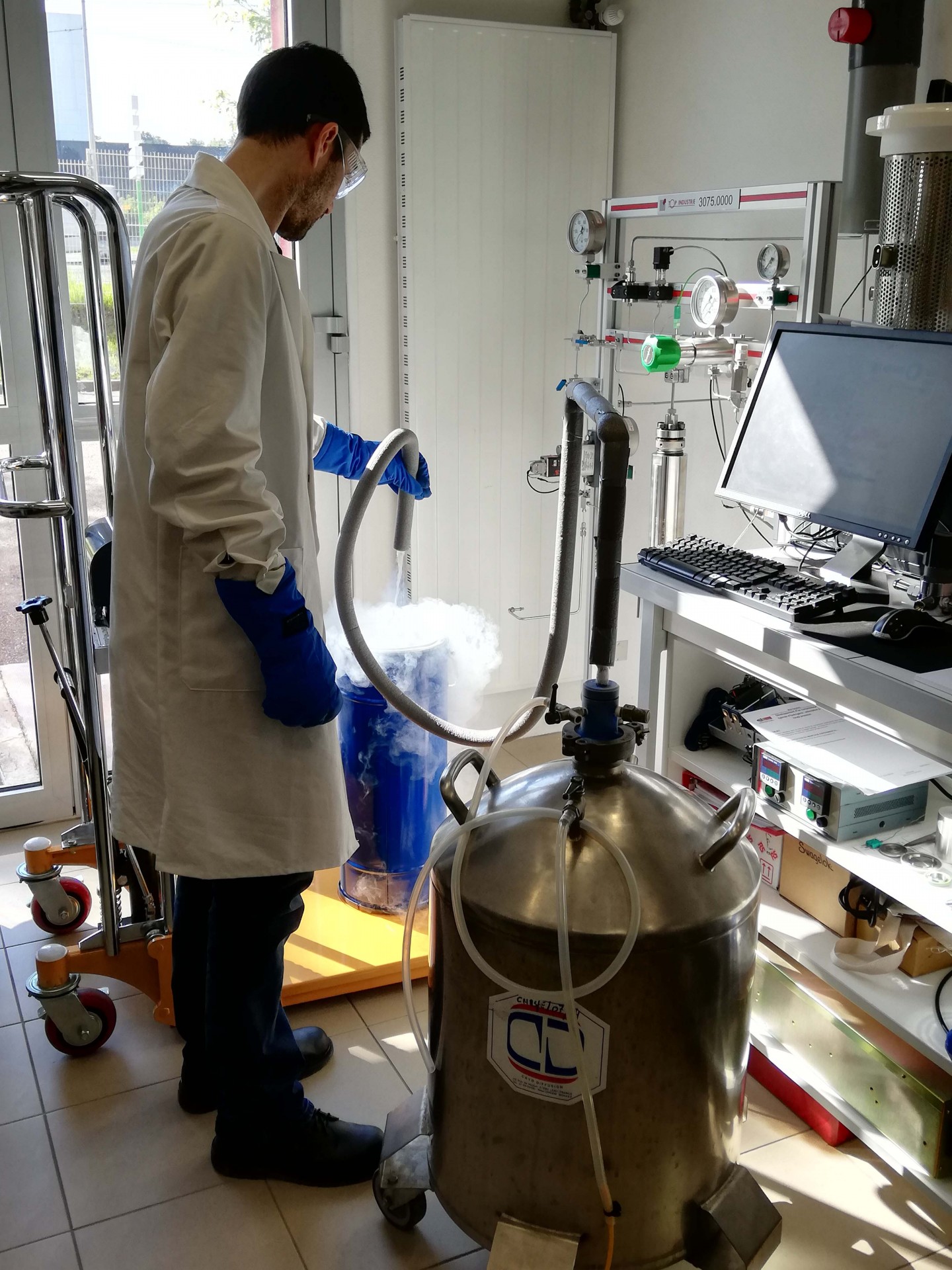 Le réservoir va ensuite être refroidi dans de l’azote liquide : une température de -196 degrés Celsius va favoriser le phénomène d’adsorption d’hydrogène dans le volume poreux du charbon actif.