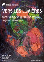 L'artiste Rébecca Samanci née en 1985 se consacre à la peinture à l'huile essentiellement depuis 2015. Titulaire d'une licence en biologie et d'un mastère 2 de scénographie d'exposition, elle élabore dans son oeuvre de peintre un travail autour de la couleur comme moyen d'expression. Après la présentation d'une première série de peintures intitulée "Atomes", l'artiste propose "Vers les Lumières". Chercheuse d'impalpabilité, d'éphémérité et de mouvement, les oeuvres de cette série explore l'âme et ses sinuosités, une intériorisation à l'instar du tableau "Origine de la Vie", une vision d'un rêve fait par l'artiste, encore de "Profondeur", symbole d'une introspection. Les couleurs pures et vives et la texture de la peinture brutalement visible témoignent du caractère spontané des compositions. La lumière est le guide, et les "lumières" ce que l'artiste cherche à atteindre. En résonance avec les tableaux, de courts textes poétiques accompagneront l'exposition des oeuvres.