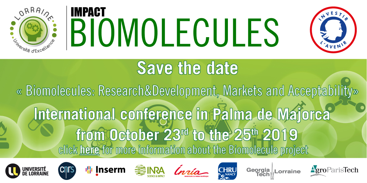 Le projet IMPACT Biomolécules organise la conférence internationale Biomolecules: Research & Development, Markets and Acceptability du mercredi 23 octobre au vendredi 25 octobre 2019, à Palma de Majorque.