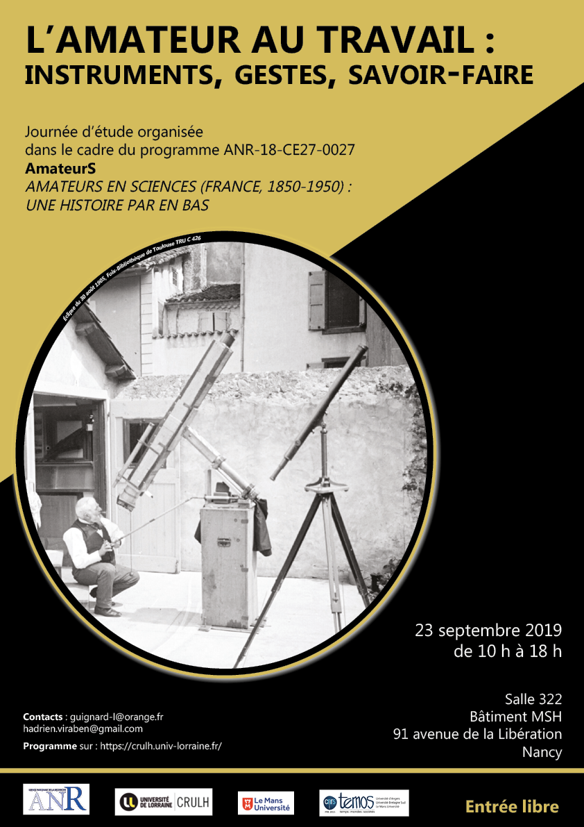 Cette première journée d’étude du programme ANR AMATEURS EN SCIENCES (FRANCE, 1850-1950) : UNE HISTOIRE PAR EN BAS propose de questionner les productions matérielles des amateurs dans le but de remonter des objets, ou de leurs descriptions iconographiques ou textuelles, à leurs pratiques, aux gestes et compétences qu’elles mobilisent. La journée s'attachera particulièrement aux points suivants: