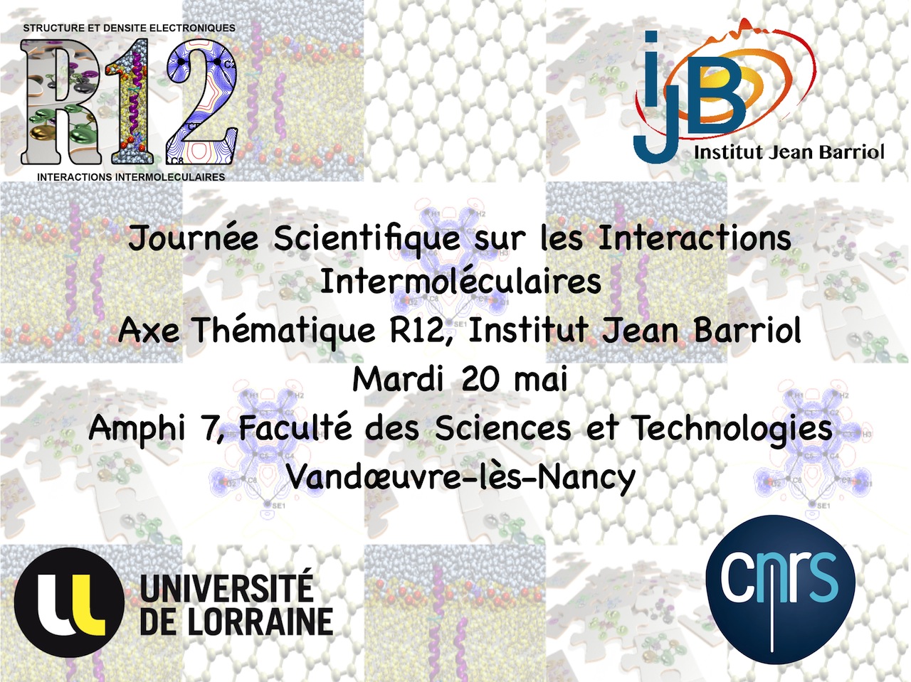 Dans le cadre de l'animation scientifique de l'axe R12 de l'Institut Jean Barriol, une demi-journée sur la thématique des Interactions Intermoléculaires sera organisée le 20 mai à partir de 14h15 à la Faculté des Sciences et Technologies de l’Université de Lorraine (site de Nancy), Amphithéâtre 7.