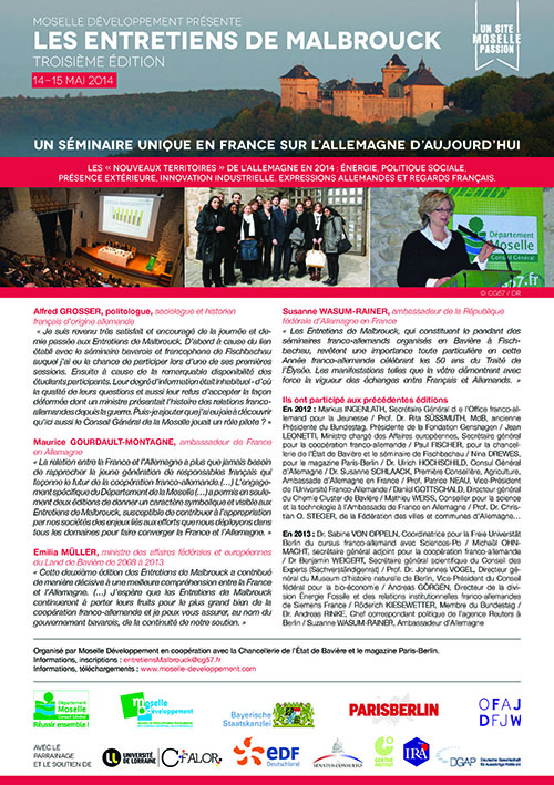 Le Centre Franco-allemand de Lorraine (CFALOR) coorganise cette année, avec Moselle Développement, la 3ème édition des Entretiens de Malbrouck qui se déroulera au Château de Malbrouck à Manderen et dont le thème portera sur « Les nouveaux territoires de l’Allemagne en 2014 : espace intérieur géographique et social, nouveaux marchés et zones d’influence, champs de la recherche et de l’innovation ».