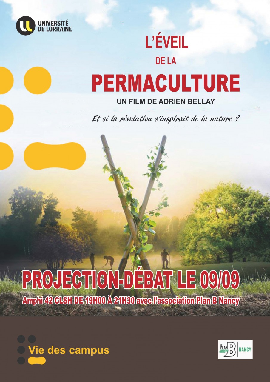 9 septembre : Projection-débat "L'éveil de la permaculture" animé par l'association Plan B dans le cadre du thème annuel de l'Université de Lorraine : le développement durable.