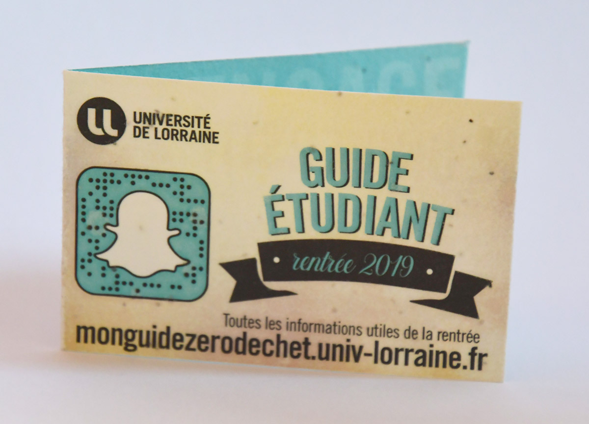 Comment transmettre un document imprimé sans générer de déchets ? C’est en répondant à cette problématique que l’Université de Lorraine édite son guide de l’étudiant 2019. Imprimé en 20 000 exemplaires chaque année, l’université souhaitait réduire drastiquement l’impact environnemental de l’impression de ce document « culte » dans le paysage universitaire, destiné, une fois consulté, à devenir un déchet.