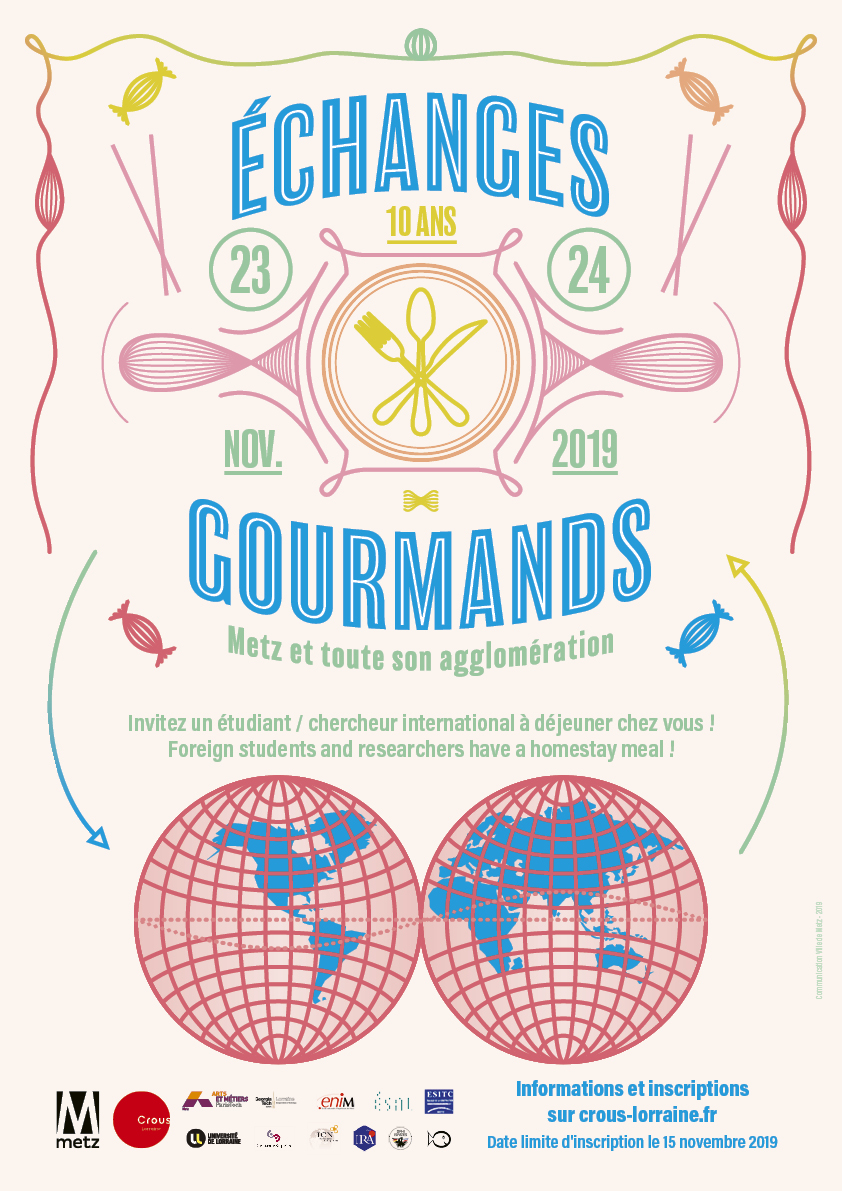Pour participer à cet événement festif et convivial, inscrivez-vous avant le 15 novembre 2019 sur http://www.crous-lorraine.fr/international/echanges-gourmands/