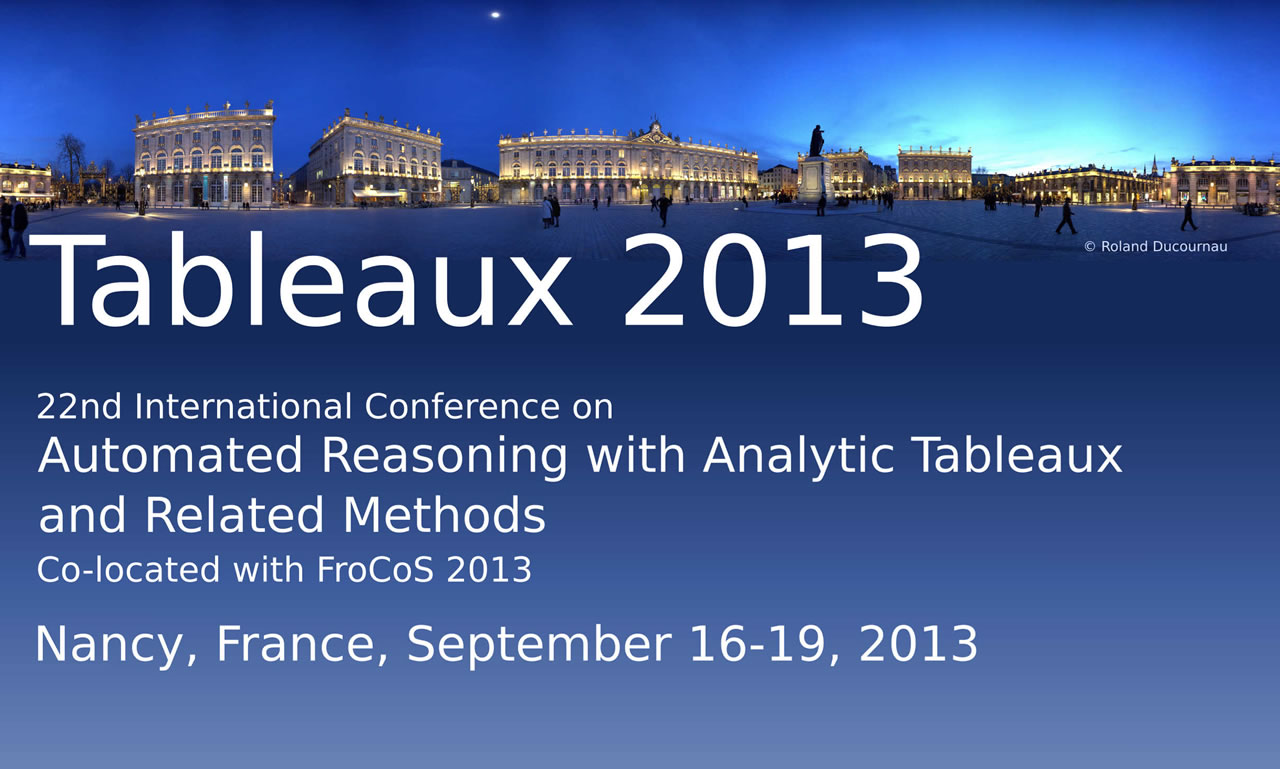 La conférence Tableaux 2013 est ouverte aux applications des méthodes formelles fondées sur la déduction automatique ou semi-automatique à des exemples de taille réelle, par exemple dans les domaines suivants : vérification de logiciels et de hardware, ingénierie de la connaissance, web sémantique.