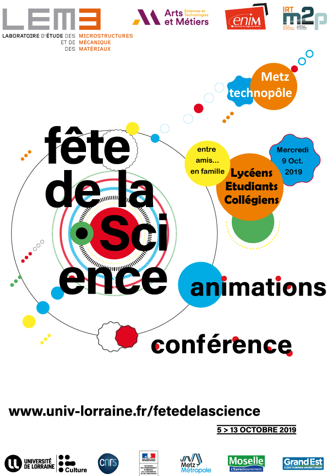 Lycéens, Etudiants, Collégiens, entre amis ou en famille, participez à un circuit guidé pour découvrir notre activité de recherche en mécanique des matériaux, de façon ludique et en groupe de 4 à 5 personnes : le mercredi 9/10/2019 à 15h (dernier départ à 15h15) - Réservation obligatoire : http://bit.ly/LEM3_Parcours_Scientifique