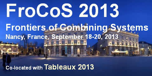 La conférence FroCoS se tiendra dans la même semaine que Tableaux, du 16 au 20 septembre 2013. La co-localisation à Nancy des deux conférences apparentées permet d'offrir une alternative européenne particulièrement intéressante par rapport à CADE qui se tient aux Etats-Unis. 80 participants sont attendus pour l'ensemble des deux conférences.
